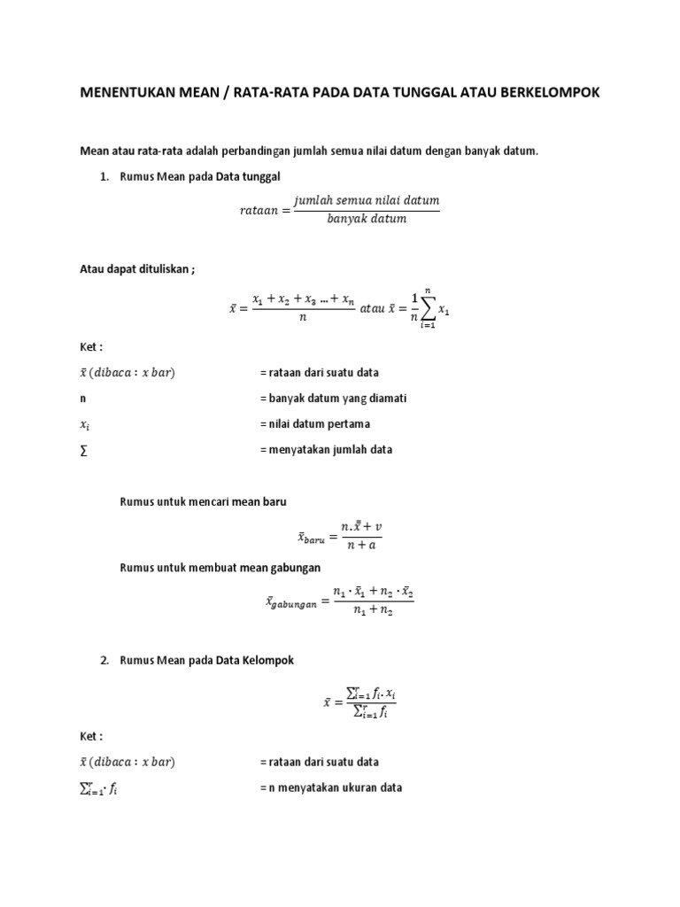 Pengertian mean adalah rata rata dari seluruh data. Modus data berkelompok bisa ditentukan berdasarkan nilai tengah kelas interval yang memiliki frekuensi terbanyak. Hal ini diakibatkan spaya data yang akan disajikan lebih terlihat sederhana dan lebih mudah untuk dibaca atau dianalisis.