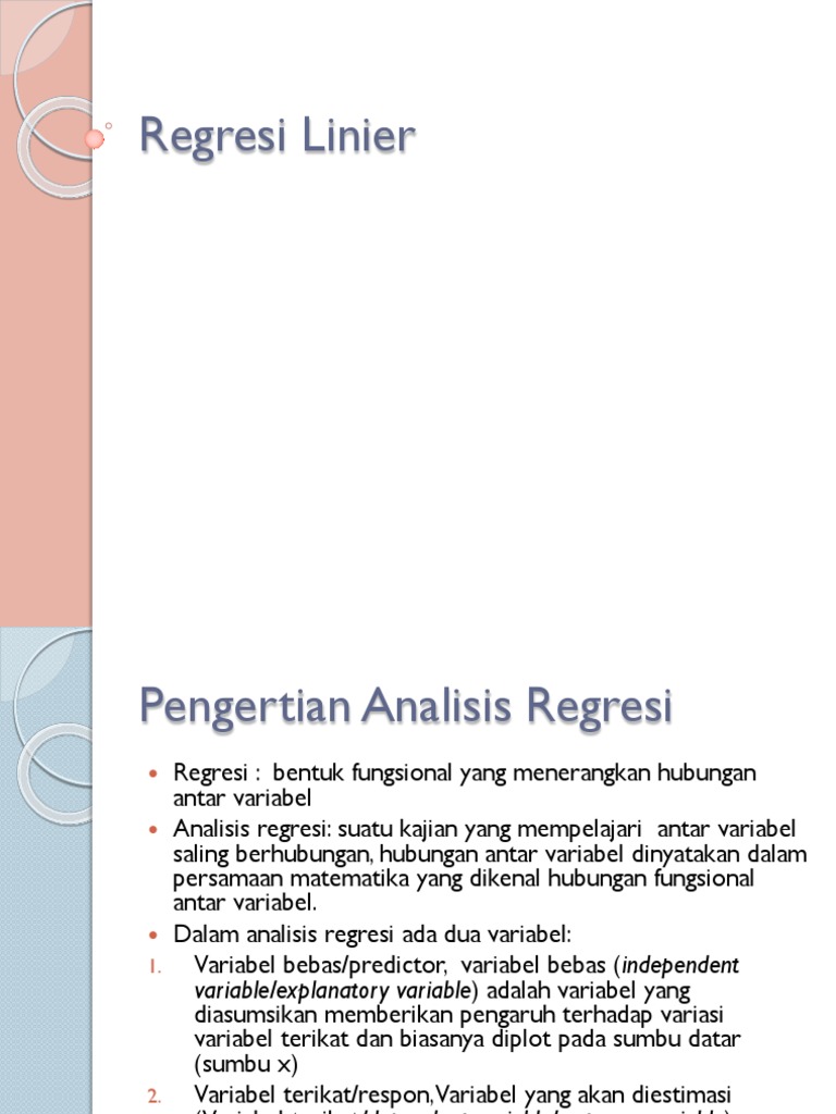 Dalam penelitian peubah bebas x biasanya peubah yang ditentukan oleh peneliti secara bebas misalnya dosis obat lama penyimpanan kadar zat pengawet umur ternak dan sebagainya. Regresi linier sederhana adalah salah satu metode analisi statistik yang membahas hubungan dari dua variabel yaitu satu variabel x dan satu variabel y. Dalam artikel ini kita akan fokus membahas hubungan satu variabel bebas dengan satu variabel terikat.